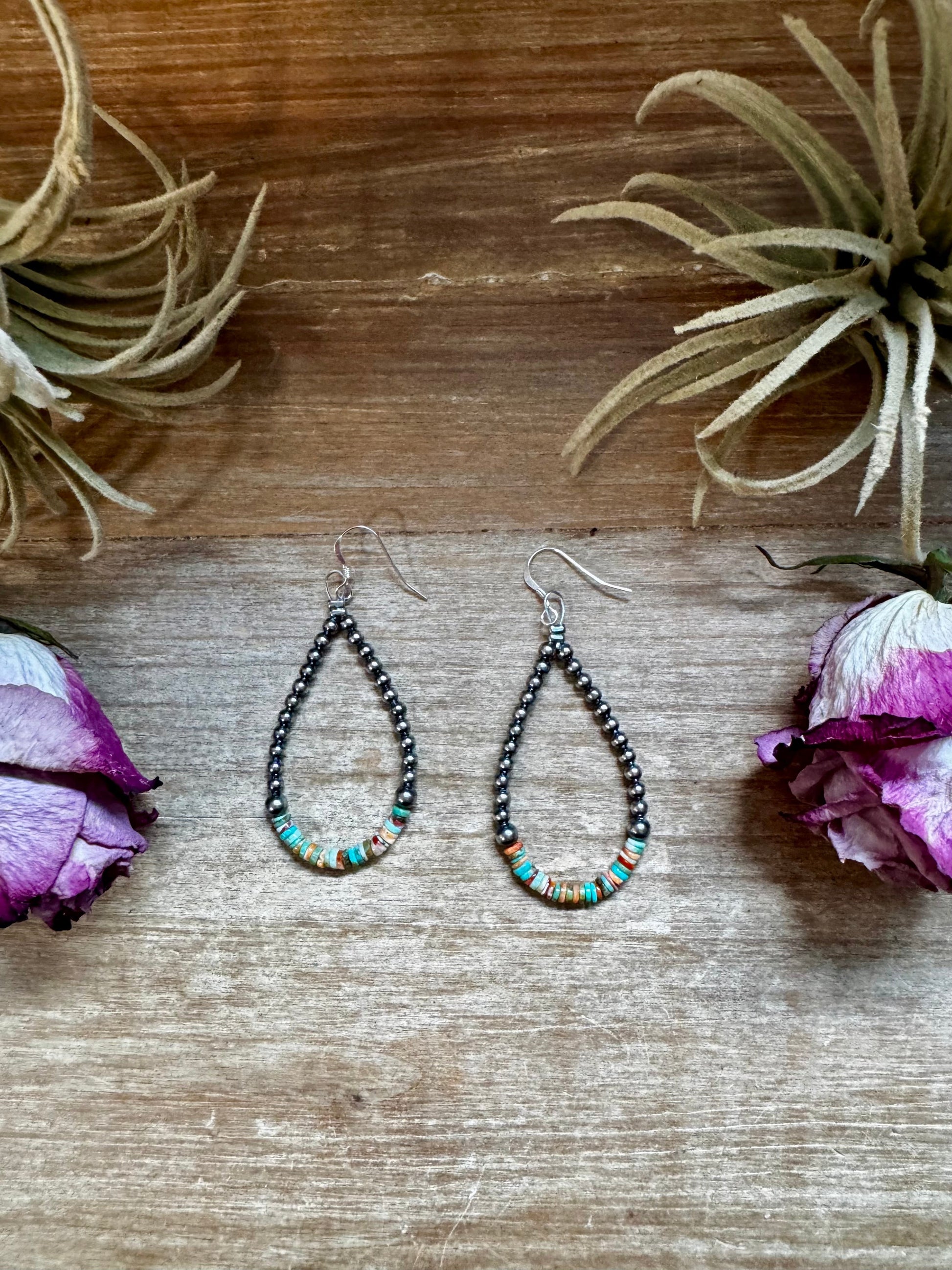 Handmade in the USA by The Bijoux FAB, these sterling silver hook earrings feature vibrant green and orange heishi beads framed with sterling silver pearls. Each earring is crafted with 3mm sterling silver pearls and accented with two 4mm pearls, balancing the colorful heishi design. Measuring 2.5 inches in length, they’re lightweight, comfortable, and add the perfect pop of Southwestern color to any look.