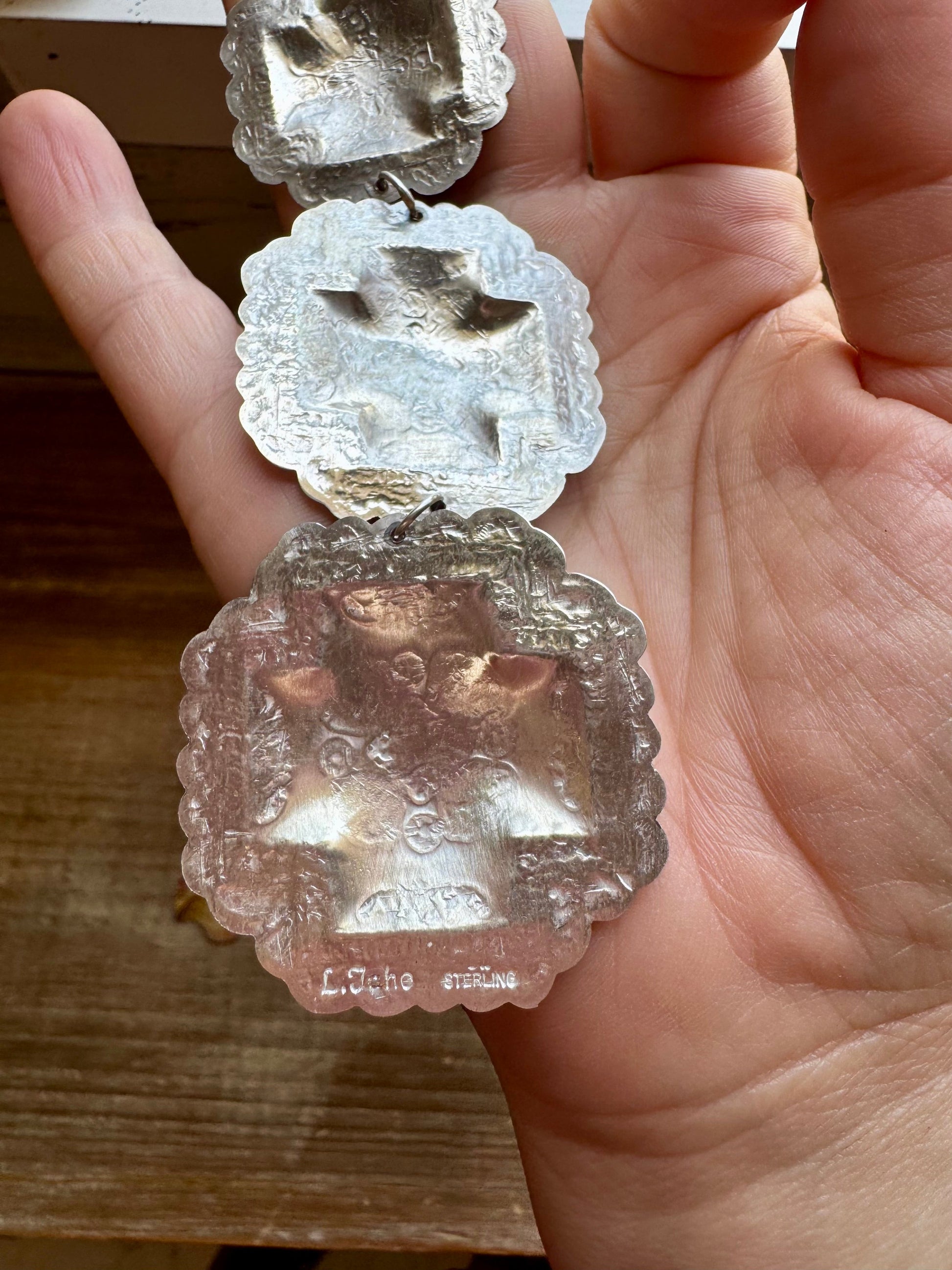 Big, bold, and beautifully handcrafted. These 3-tier concho earrings are made by renowned Native silversmiths Leander & Rhonda Largo. Crafted entirely in sterling silver with post-backs, they measure 4½ inches long and bring serious statement energy—without the heavy feel you'd expect. An iconic piece of wearable art.