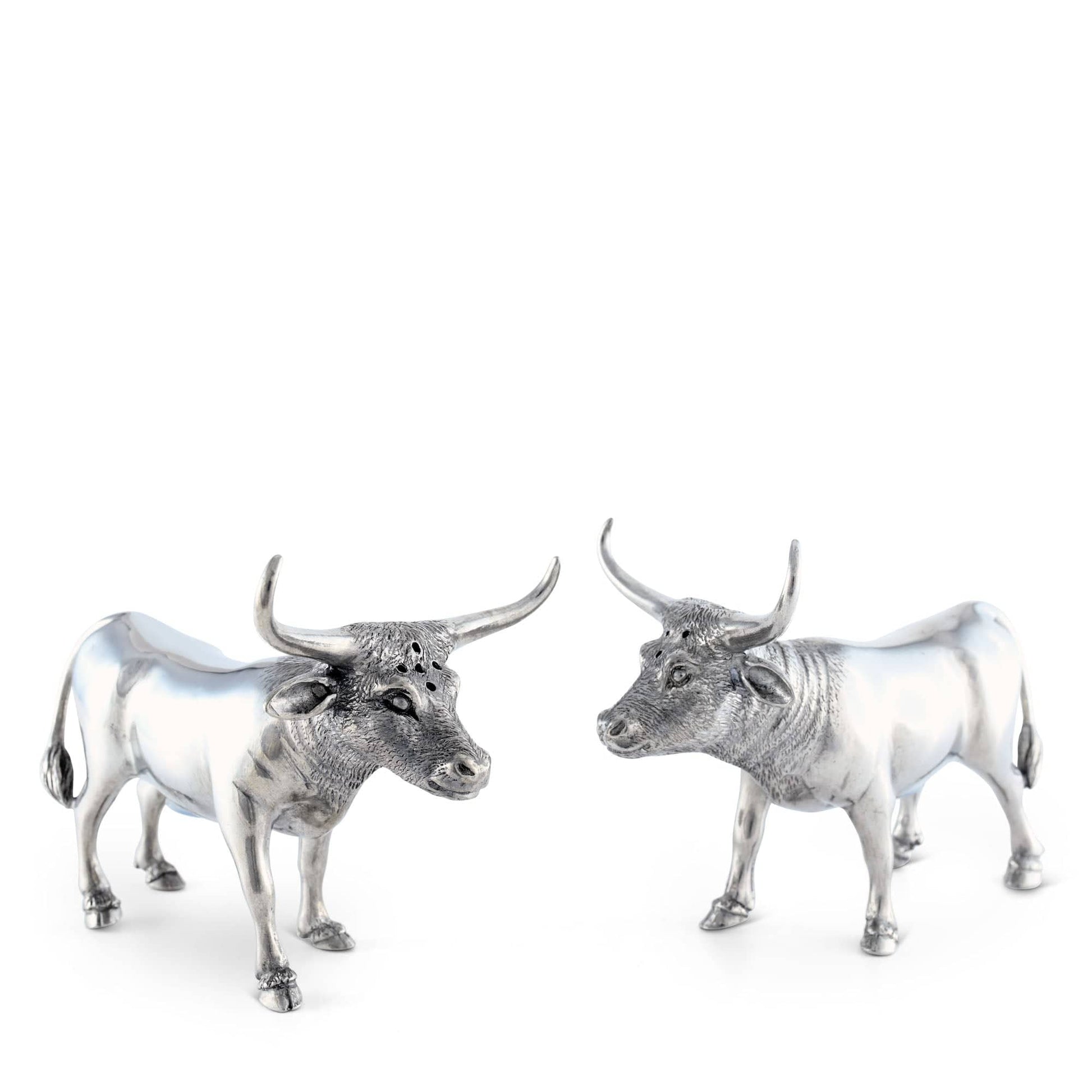 This pair of longhorns is home on the range in your ranch kitchen or at your barbeque buffet. Handcrafting in luxury grade pewter allows for the exquisite details, inquisitively tilted heads, coarse coats and tufted fetlocks.